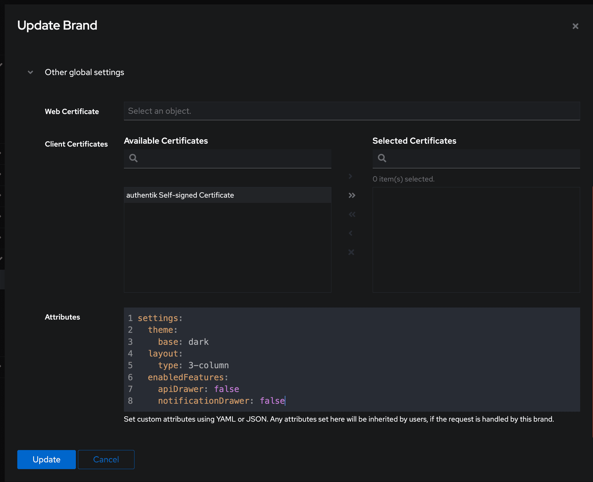 The following screenshot shows the syntax for setting several attributes for a brand: dark mode, a 3-column display of applications on My applications page of the User interface, and hiding the API and Notifications drawers from the Admin interface tool bar.